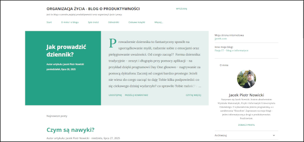 Blog "Organizacja życia" jest moim blogiem o szeroko pojętej produktywności. Wykonałem go w serwisie Blogger.